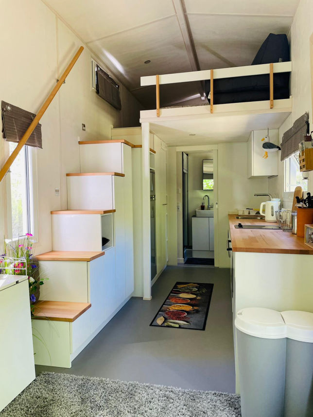 Auf zwei Ebenen befinden sich Wohn- und Essbereich, Küche, Bad und die Dusche. Mit einer Treppe geht es in die Schlafempore, dort ist ein Doppelbett (180x200cm). Im Wohnbereich gibt es ebenfalls eine Schlafmöglichkeit (90x200cm).